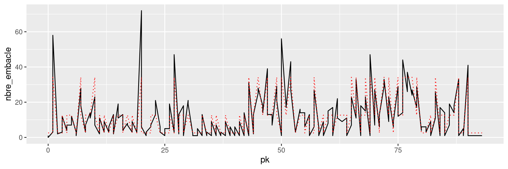 x=woodrafts$nbre_embacleggplot(woodrafts, aes(x=pk, y=nbre_embacle))+