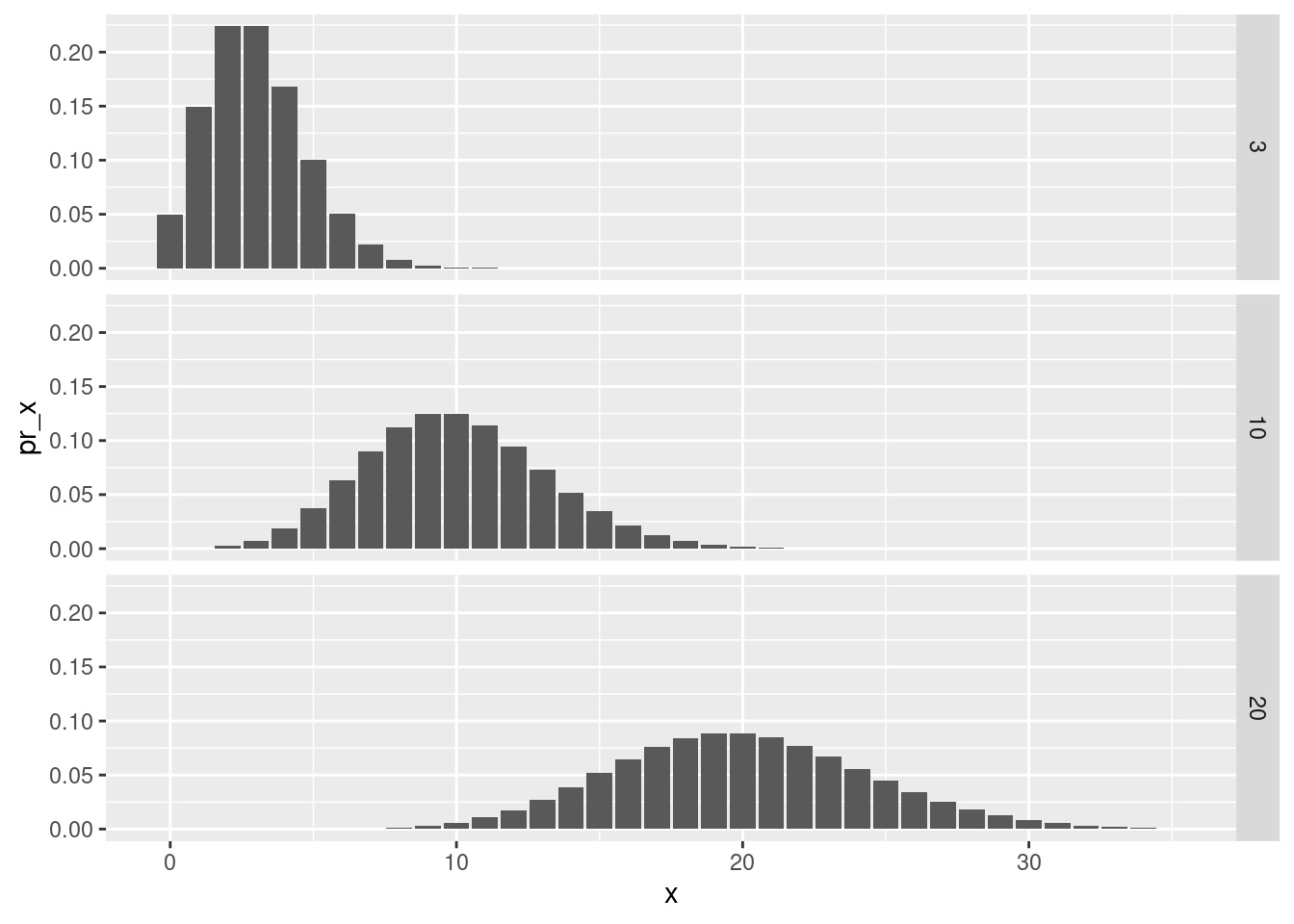 lambda0=c(3,10,20)The corresponding distributions look like this: