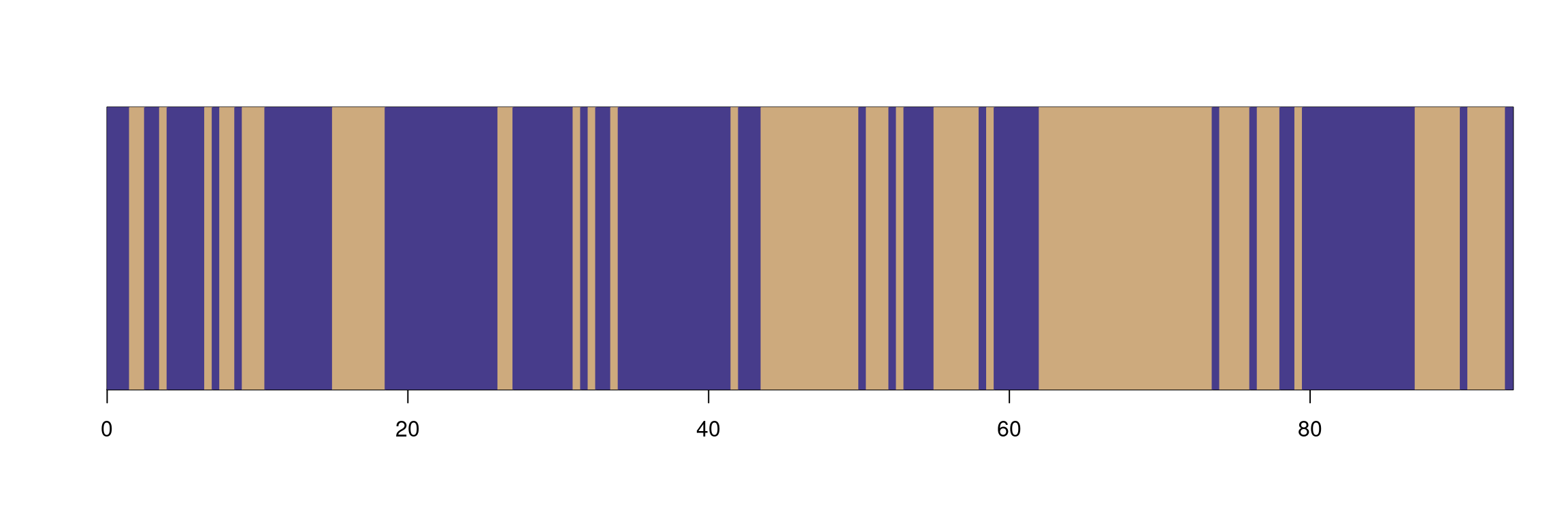 Cutting the river into (for instance) 20 equal-sized sections, we observe that the frequency of “wood” outcome seems to vary along the river (cf fig. Figure 1.2). If obsWood followed a constant binomial distribution (with a proportion of “wood” outcome \(\pi_w=\) 46.81%) all along the river, then we would have a 95% probability of observing proportions of “wood” outcome between 37% and 57%.